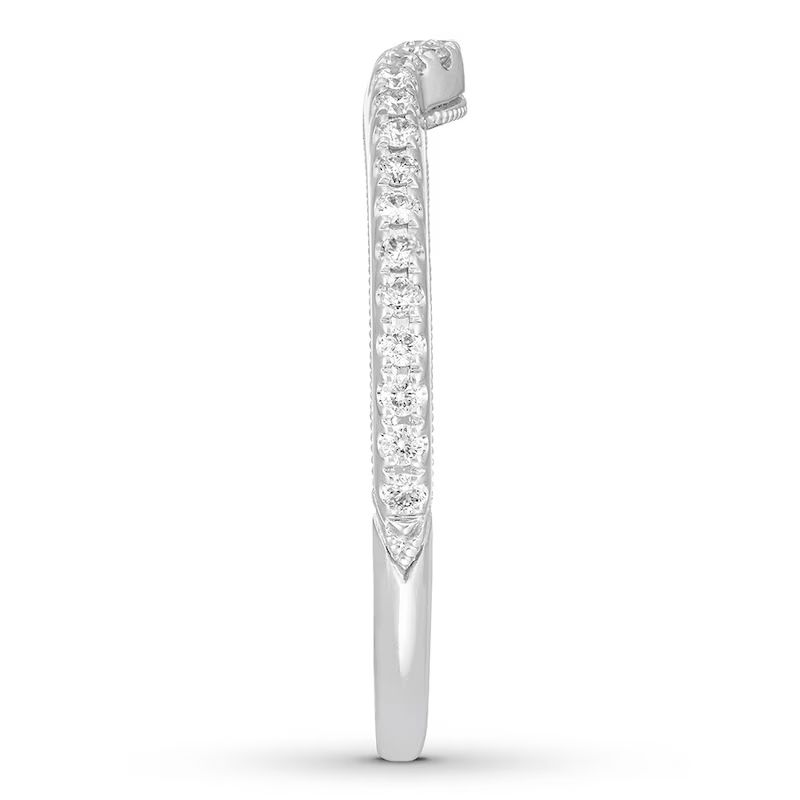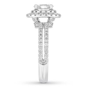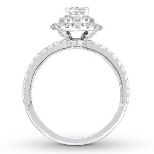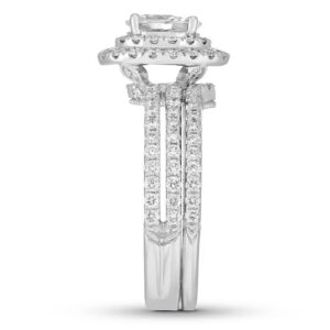 This wedding ring captures the modern beauty of a halo design. A brilliant 1 ct oval diamond center reflects a love of vintage design, while round diamonds add sparkle to the engagement ring’s split setting. The matching wedding band brings the total diamond weight to 1 7/8 carats. Both rings are crafted in 14K white gold.