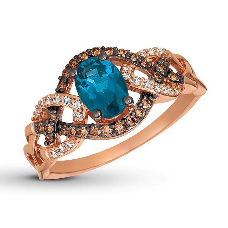 This ring is available in limited sizes. If you don’t see your size here, please visit a store to order your ring. An oval Deep Sea Blue Topaz is wrapped in drizzles of Chocolate Diamonds in this irresistible ring for her. Sparkling curves of Vanilla Diamonds complete the look, bringing the total diamond weight to 1/4 carat. The ring is styled in 14K Strawberry Gold.
