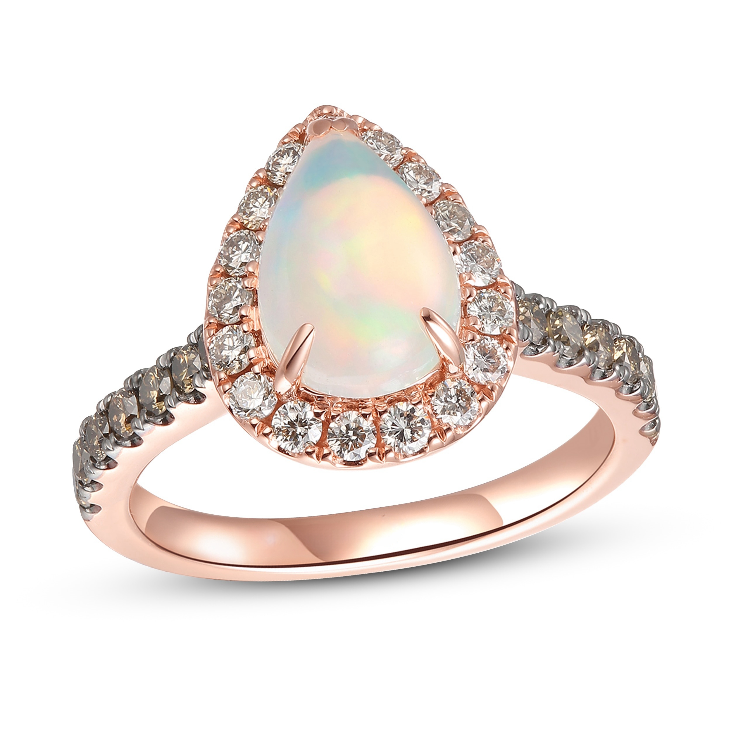 Please note: This ring is available in limited sizes. If you don't see your size here, please visit a store to order your ring.A pear-shaped Neopolitan Opal? steals the spotlight in this stunning ring for her. Sparkling Nude Diamonds? frame the center gemstone, while Chocolate Diamonds? line the band of 14K Strawberry Gold?. The ring has a total diamond weight of 3/4 carat.Discover the Legend.